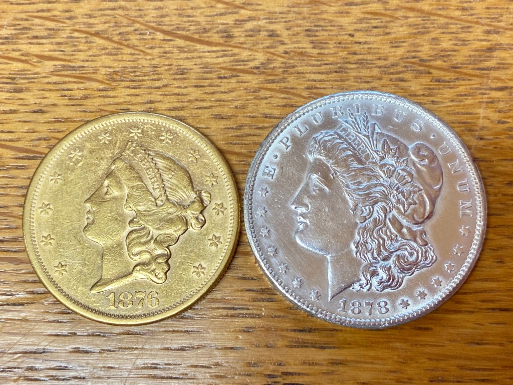 From 1933 until 1964 a dollar was essentially defined as three quarters of an ounce of silver — an ounce minus the government’s share you might say. (The lower denominations of coinage minted in silver — the half dollar, quarter, and dime, are proportionally smaller: a half dollar contained just over three eighths of an ounce and so on.) From the time my parents moved us to Lima in 1960, when I was ten, right through the year 1964, I was going into the branch bank that stood along my paper route, passing a $5 bill (not necessarily a silver certificate) or a few ones across the counter, and exchanging them for those large, round, silver dollars minted up until 1935. Even then the bank was dispensing them with dates going back to 1878. I still have many of the ones I obtained that way as well as a good deal of other small change from the period.
