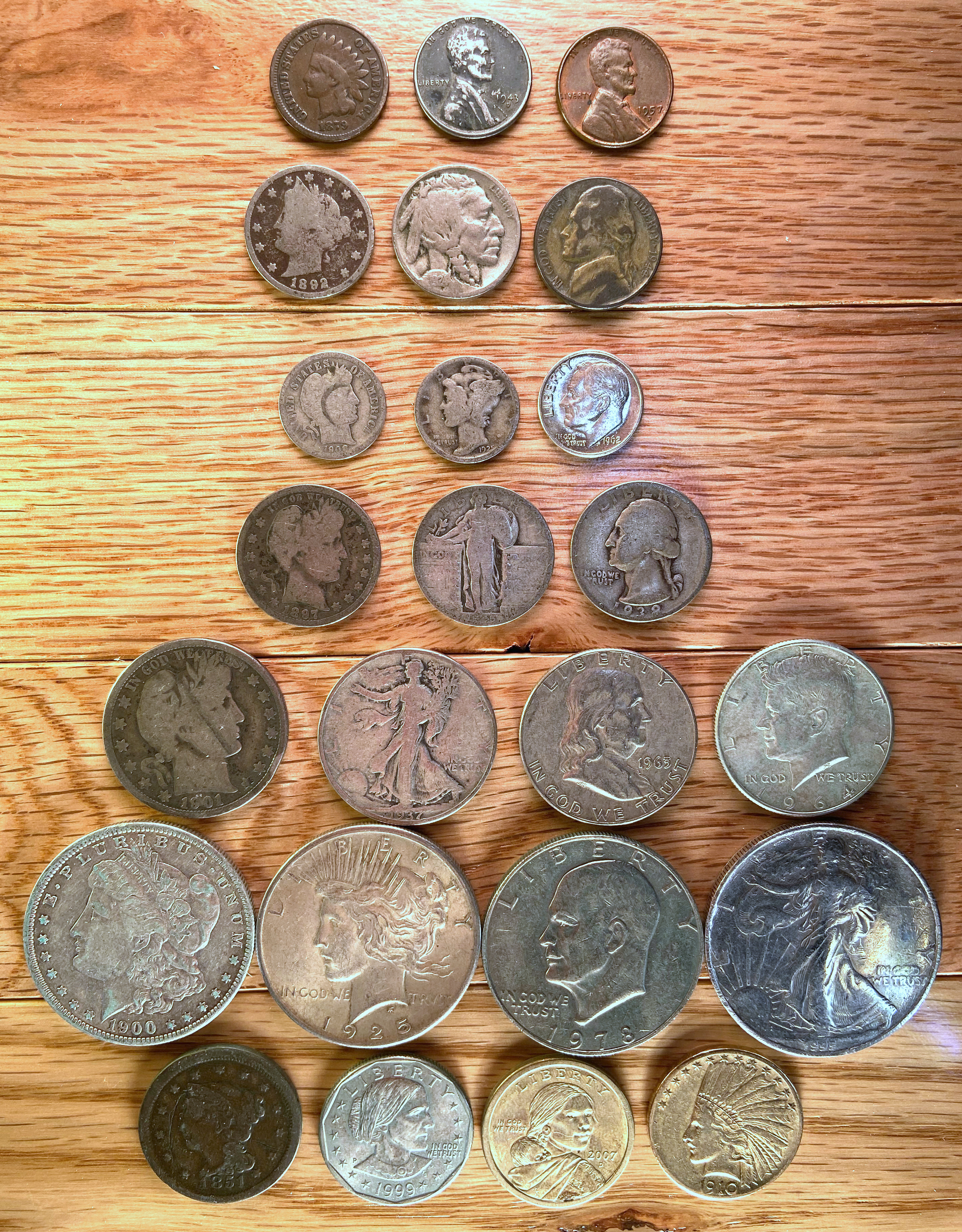The last two coins in the preceding photo, the Sacajawea dollar and the $10 gold piece, illustrate the supreme absurdity of our current currency. The Sacajawea dollar has a copper core and is clad in manganese brass (which is 77% copper). In other words, it is not only of the same size but has just about the same copper content as a penny of the early 1850s. (Doesn’t that tell you something?) And it presumes to imitate, in size, color, and subject, a half-ounce gold piece of 100 years earlier — and it calls itself a dollar, the same as the largest coin in the photo, the walking liberty silver dollar, which has been minted in the same years as poor Sacajawea. She would be better honored to adorn the larger coin.