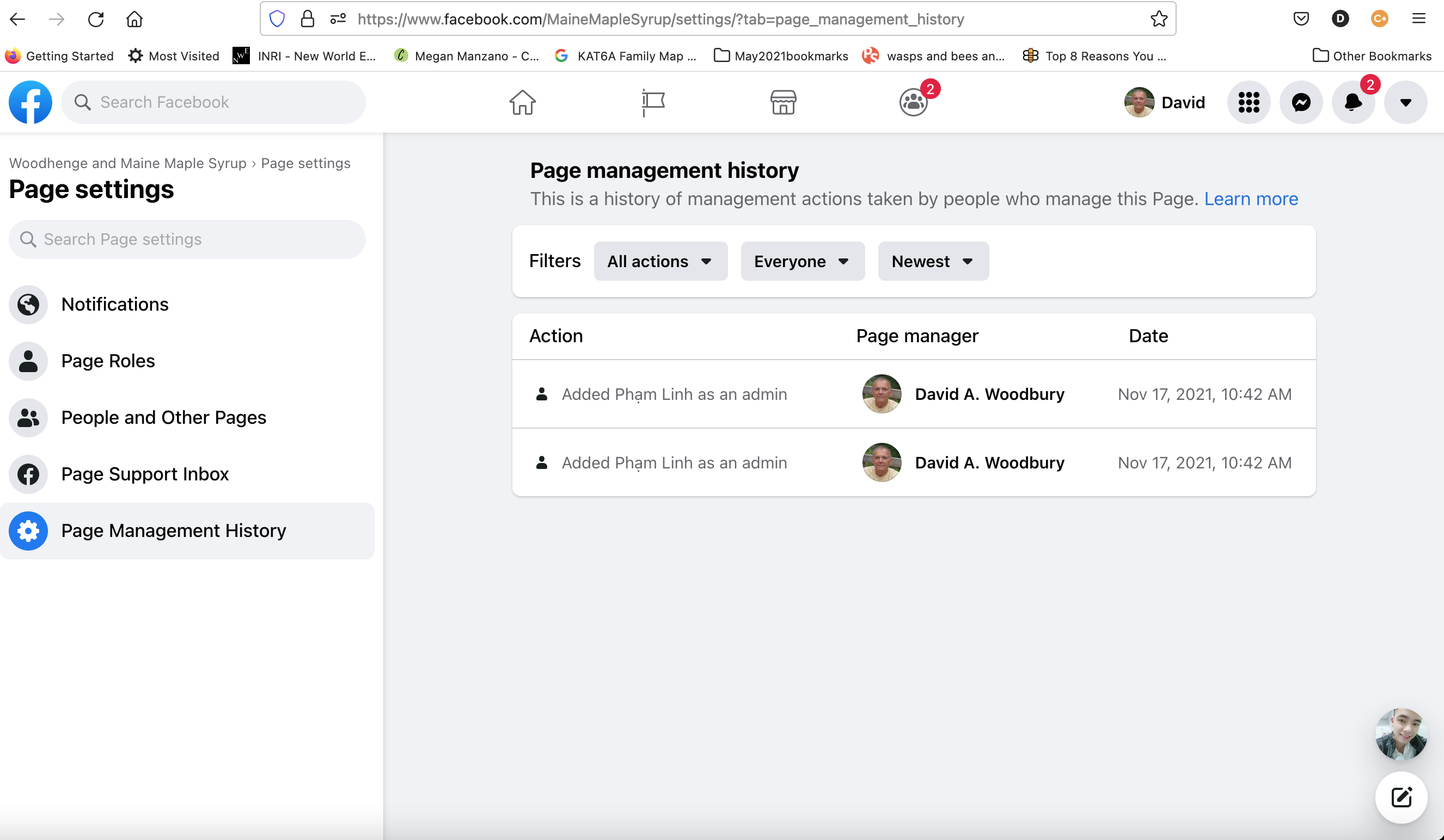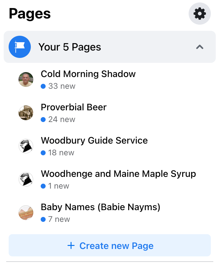 Later, I created the page /ProverbialBeer for my beer-making hobby, /MaineMapleSyrup for that hobby, and then /BabieNayms and /ColdMorningShadow for two of the books that I’ve written. All of these were contained in my /woodbury.david Facebook account.