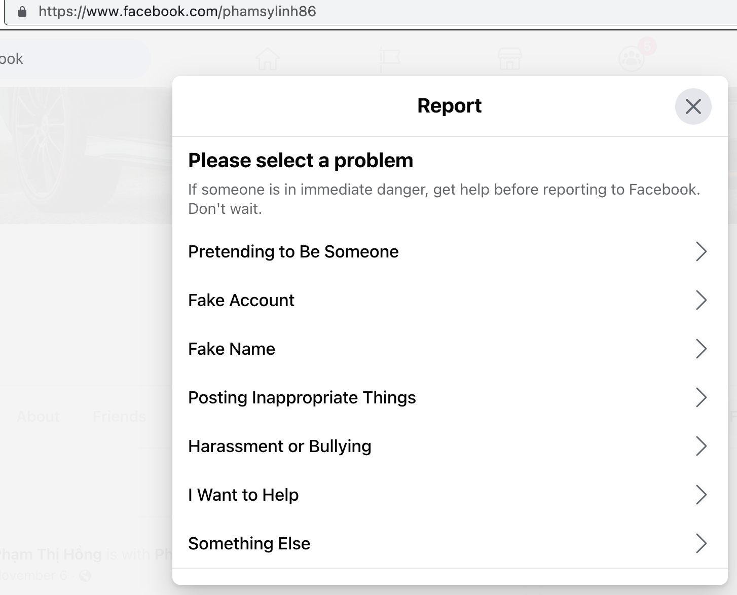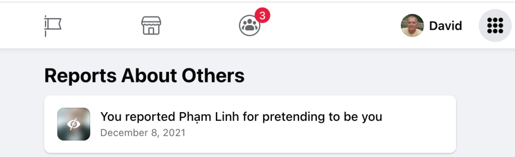I found a link on Phạm Linh’s profile to report a suspicious account, so I clicked it. There was no option to provide supporting details. I could only click Pretending to Be Someone Else (among other options) and then click Submit. I did and waited a few hours. Sure enough, Facebook replied that this person’s profile does not appear to violate their “community standards.” And since his profile says he’s one of their own and making that claim doesn’t violate their standards, then I must accept that as Facebook admission that Phạm Linh is indeed their own employee. I tried again a day later using a different violation from their list (Harassment). Same result.