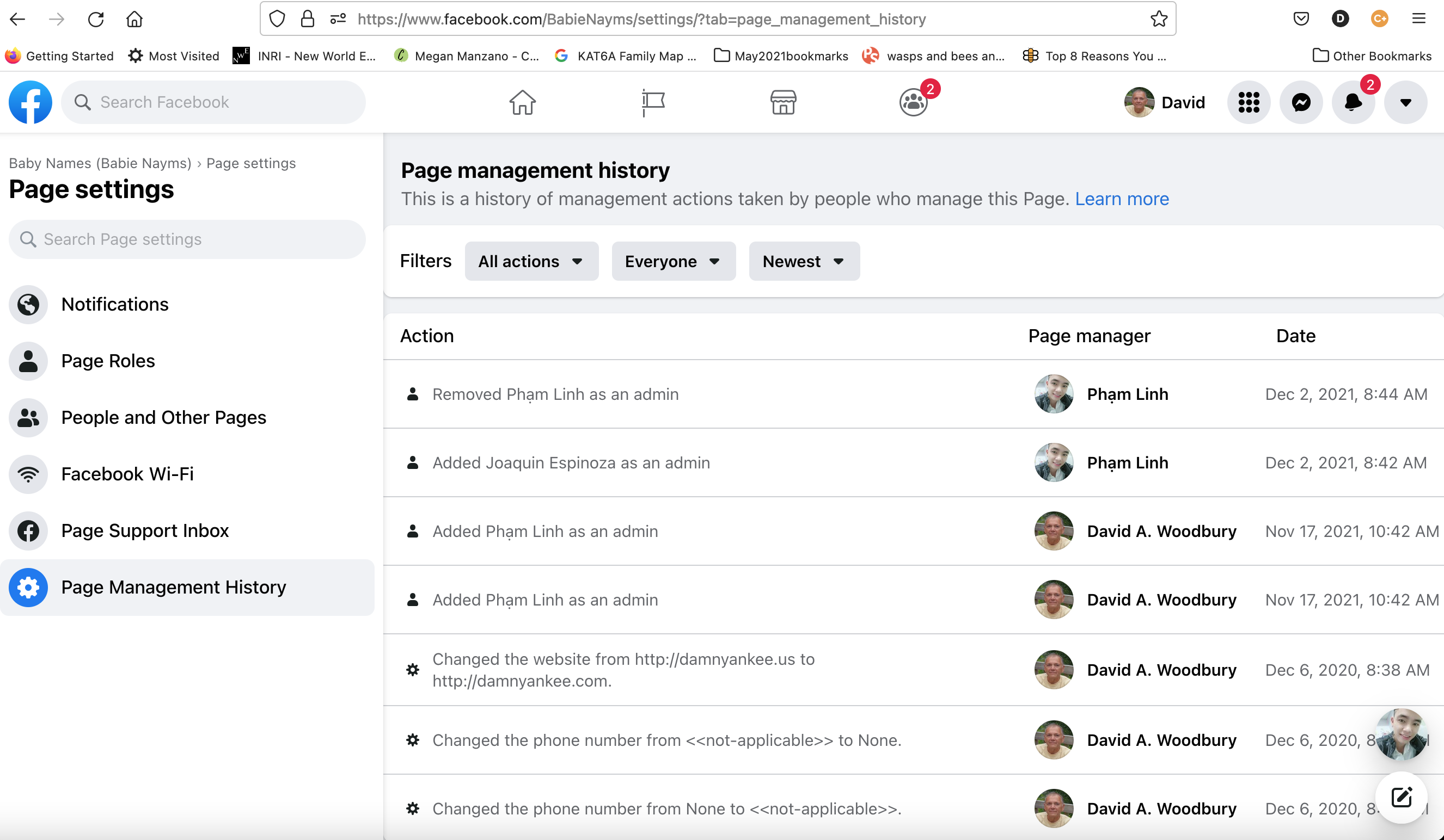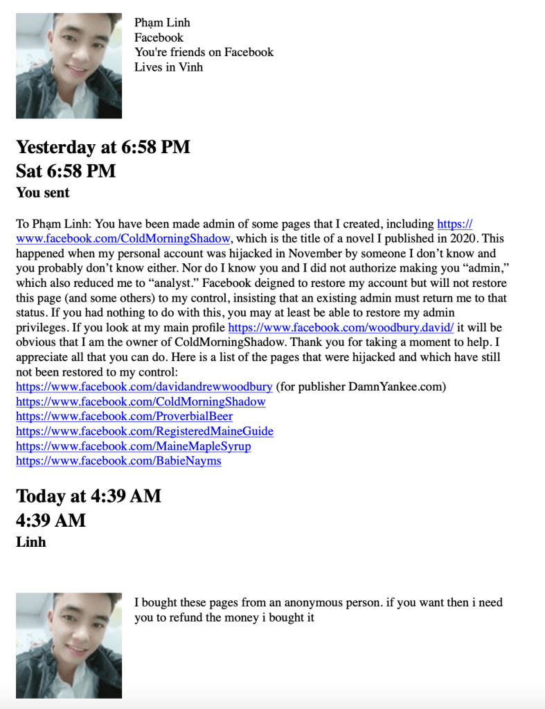 I continued daily assaults on the AI (artificial intelligence/absolute ignorance) of Facebook’s support services, unattended by human eyes, for about a week. During this time I looked up several of the names who had been granted admin privileges in my pages. I settled on one who appeared most often and who seems to have a genuine active Facebook account/profile of his own, Phạm Linh, in Vietnam. Ironically, he claims to work for Meta. Aha! — I thought — Facebook will certainly want to know this — he’s made himself the admin of my pages, also appears as my “friend,” and he pretends to be a Meta employee and even links his profile to meta.com.
