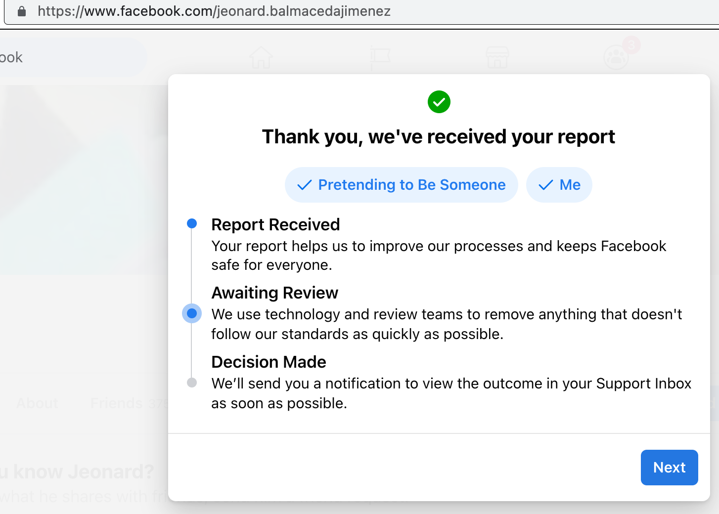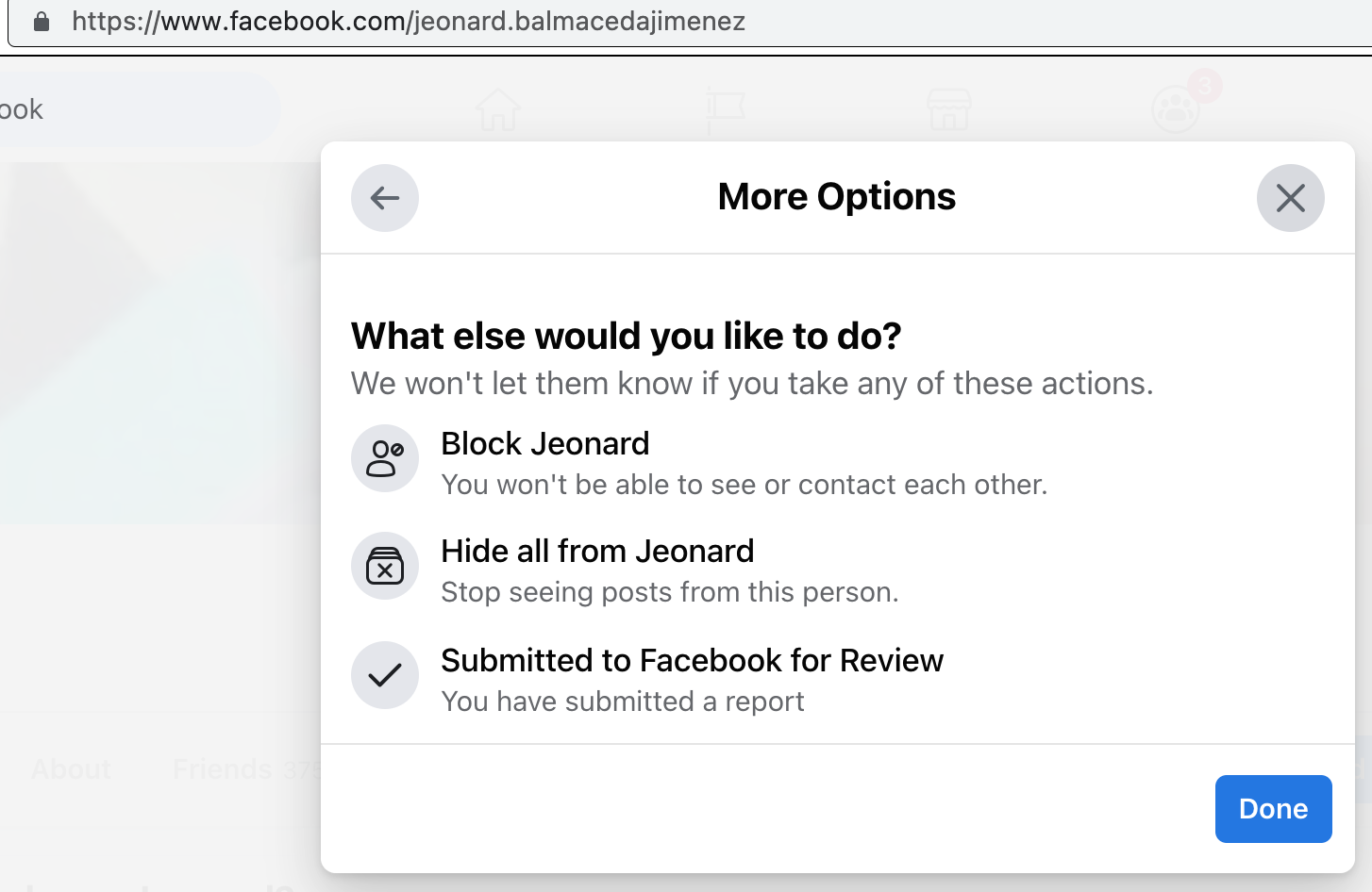 I tried this approach as well on the profile of Jeonard Balmaceda Jimenez, another unauthorized admin on one of my pages who also claims to be employed by Facebook. Same result. I tried reporting Violation of Intellectual Property. That’s also acceptable in their community standards.