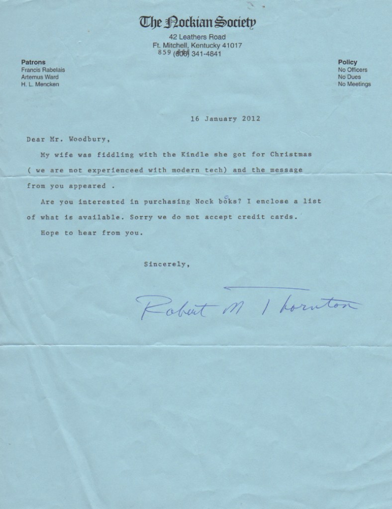 The Nockian Society itself honors Nock’s distaste for organizations, so it has “no officers, no dues, and no meetings.”  [Update as of November 2016: The Nockian Society also no longer has either web site.]  From the message that went out in the first Society bulletin: